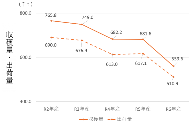 2024年(令和6年)産のみかんの結果樹面積は3万4,500haで、前年産に比べ900ha(3%)減少し、収穫量は 55 万 9,600t、出荷量は 51 万 900tで、前年産に比べそれぞれ12 万 2,000t(18%)、10 万 6,200t(17%)も減少しました(農林水産省「令和6年産みかんの結果樹面積、収穫量及び出荷量」)。
