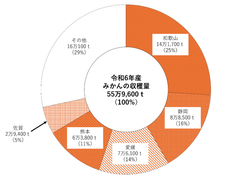 2024年(令和6年)産のみかん収穫量を都道府県別に見ると、和歌山県が25%、静岡県が16%、愛媛県が14%、熊本県が11%、佐賀県が5%となっており、この5県で全国の7割を占めています(農林水産省「令和6年産みかんの結果樹面積、収穫量及び出荷量)。