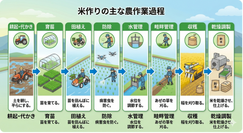 中でも水稲農業は工程が多く、どれも重要です。耕起・代かき、育苗、田植え、防除、水管理、畦畔管理、収穫、乾燥調製と、それぞれが連動しており、どこか1カ所の滞りが全体に影響を及ぼすこともあります。
