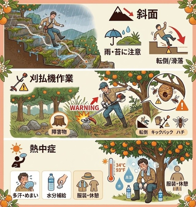 柑橘園でのリスクは単に移動するだけでも大きい傾向があります。除草や作業中の熱中症なども近年特に注意喚起されている(イラスト:SMART AGRI編集部(生成:Google Gemini)