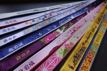 越前織:ネームタグ丸岡は織物の一大産地で、ワッペンやスポーツ用ネームとして用いられる「織ネーム」は需要が高まっており、また、コンピュータで図柄処理し織物として描画する「越前織」も観光の土産等向けに作っています。主要製品は洋服に施すネームタグで、国内シェア7割を誇ります。