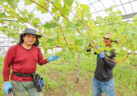 「農業に興味があった、というより、それまで長い会社勤めだったから、自分流で好きに(事業を)やって見たかった。自分で思うように自由になりたかったのが、ここに来た動機」。こう話すのは坂井市の三里浜で園芸を始めて7年目という鯉田貴博さん(62)。30度超えのハウスの中、インドネシアからの研修生を引き連れ、6年前から作りだしたシャインマスカットの枝に結束テープを巻き付けながら汗を流していた。大阪生まれ、福井とはまったく縁がなく、50歳までは農業とも接点がなかった。