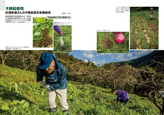 「作物別編」では、水田・畑作物・野菜・花・果樹・茶・畜産の技術を品目ごとに網羅。有機農家の経営事例や品目別のつくりこなし、課題克服の工夫も記されている。雑草や病害虫対策も充実しており、農水省が発表しているみどりの食料システム戦略の「技術カタログ」にも多数対応している。