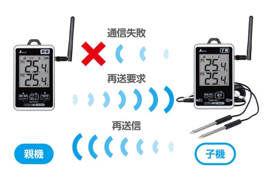 また、通信失敗の要因があっても、親機から子機へ向けて再送要求の信号を送り、子機から再送信された計測値を受信して自動的に再接続する。