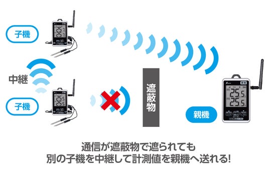 遮蔽物があって通信が難しい環境では、子機の中継機能を使うことで、子機同士で計測データをまとめて共有し、通信できる子機から親機へまとめたデータを一括送信することが可能。