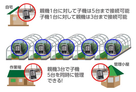 1台の親機に最大5台の子機が登録でき、親機は3台まで同一子機を管理できる。そのため、自宅や作業場に親機を設置することで、いつでも子機の置かれた場所の温度の状態を確認することが可能。