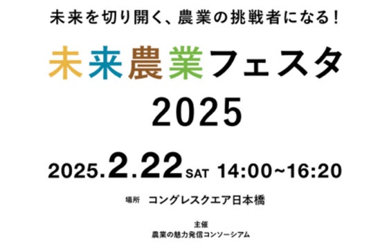 農業の魅力発信コンソーシアムは、若手農業者と未来の新規就農者との交流を図るイベント「未来を切り開く、農業の挑戦者になる!未来農業フェスタ2025」を、2025年2月22日(土)にコングレスクエア日本橋で開催する。参加費は無料で、申し込みが必要。YouTubeで生配信も行われる予定。