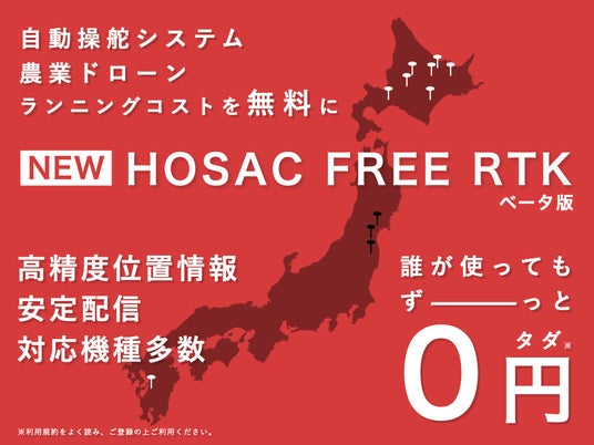 HOSAC FREE RTKを活用すれば、RTKにかかるランニングコストなしでRTK補正情報を利用でき、コストを抑えながら高精度な操舵が可能に。なお、HOSAC FREE RTKは、北海道・宮城県・熊本県で展開されており、順次全国展開していく予定とのこと。