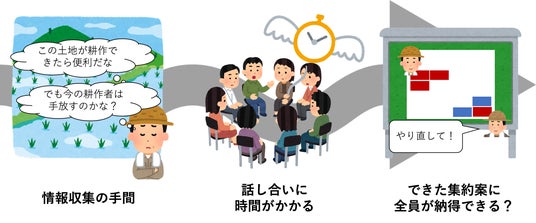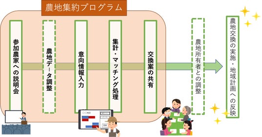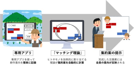 農地集約システムとは、PCやモバイル端末を用いて農家から耕作地に対する選好情報を収集し、これらの選好情報とマッチング理論に基づいたアルゴリズムを用いることで、農家が納得できる農地の集約案を自動的に作成するもの。この集約案をたたき台とすることで、市町村が地域計画を作成する手間を大幅に短縮するほか、話し合いだけでは気付くことが難しい潜在的な農地交換の可能性を発見できる画期的なツールだという。