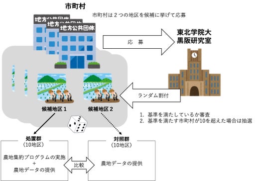 実証事業は市町村単位で行い、ランダム化比較実験(RCT)と呼ばれる実験手法を用いる。参加市町村がプログラムを実施する候補を2地区挙げ、同研究室においてそのうち1つを実施地区、残り1地区を非実施地区としてランダムに選定する。そのうえで、実施地区と非実施地区の事業実施前後における農地利用の変化を比較する。