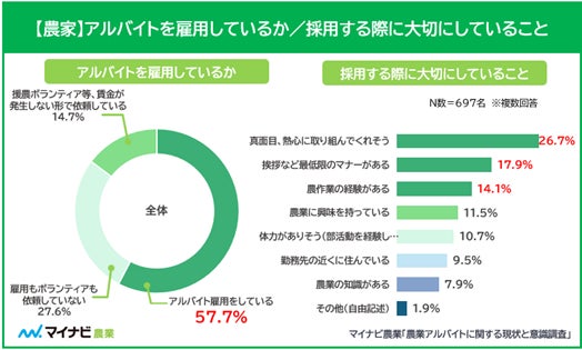 一方、農家に対する調査では、57.7%が「アルバイト雇用をしている」と回答。農家がアルバイトを採用する際に大切にしていることについては、「真面目、熱心に取り組んでくれそう(26.7%)」と回答した人が多く、次に「挨拶など最低限のマナーがある(17.9%)」という回答が見られた。これにより、経験よりも意欲とマナーを重視していることがわかったという。