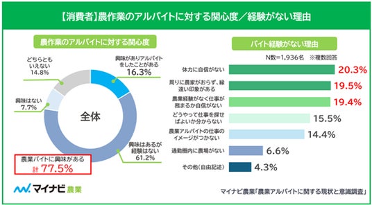 マイナビ農業は、農家697名、消費者1936名に調査を行った「農業アルバイトに関する現状と意識調査」の集計結果を発表した。