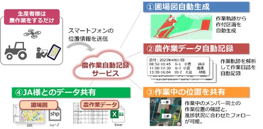 また、このサービスで得られた農作業データを農業従事者や関連機関全体で共有することで、農作業の実態や課題に応じた個別の作業計画の立案と、作業内容の質的向上や作業負荷軽減が可能となる。