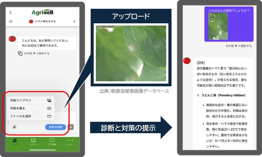 きゅうりトマトなすびが運営する農業特化型生成AIサービス「ノウノウ」の技術を活用したもので、栽培品目・地域に応じた相談に24時間対応し、病変部の写真をアップロードすることで病害虫診断が行える。日本語のほかに英語、中国語、ベトナム語、インドネシア語に対応している。