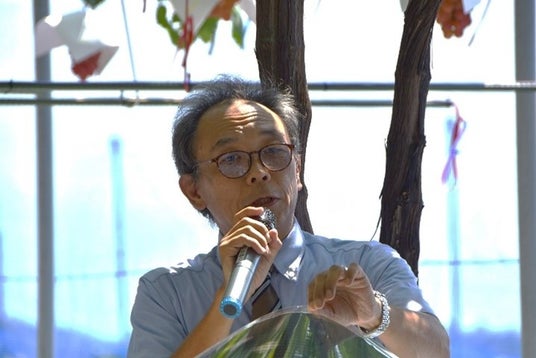 「今回の実証は『発電』と『農業栽培』の両立を目的として『サンシャインレッド』の栽培を行った。従来の『ソーラーシェアリング』とは異なり、『ソーラーマッチング』という独自の概念を採用している。有機薄膜太陽電池は、色の選択性と再現性に優れており、軽量で光を透過できることが特徴だ。ペロブスカイト太陽電池と混同されることがあるが、この技術は有機物を使用し、鉛やスズを含まないため安全性が高い。果樹での実証は初の試みであり、少し心配もあったが今日の様子を見る限り、うまくいったようで安心している。有機薄膜太陽電池は農業分野で非常に期待が高い技術で、山梨県とタッグを組んで、取り組んでいきたい」
