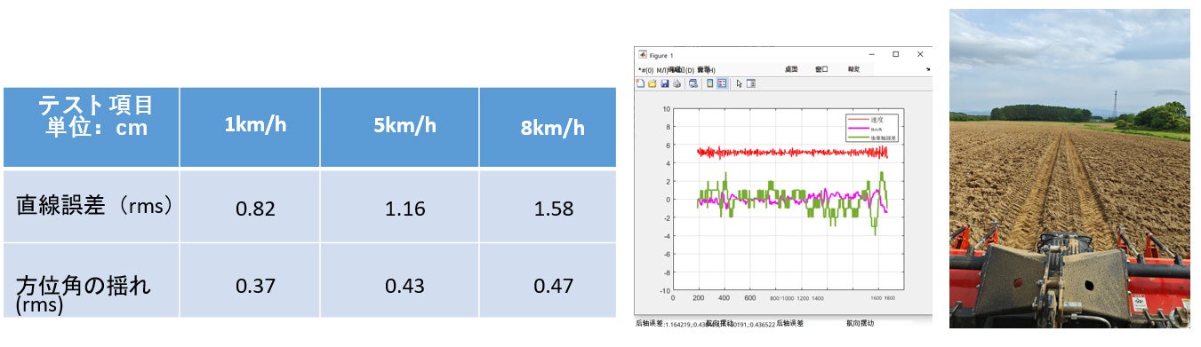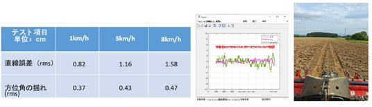 「直線走行精度」評価試験では、CLAS対応ナビゲーション機器を搭載した農機を使用し、1km/h、5km/h、8km/hの異なる作業速度で直線走行を実施。GPSログデータを収集し、走行のズレと進行方向のブレを分析した。
