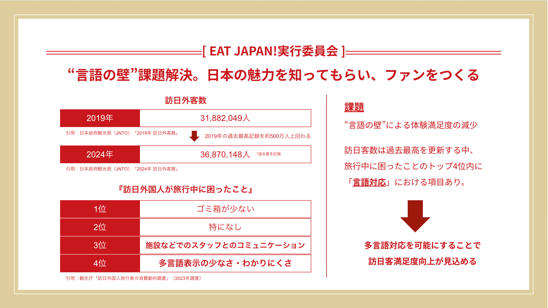 訪日外国人の数は、2024年に過去最高の3687万人を記録し、2025年もさらなる増加が見込まれている。旅行者の多くは「日本食」「伝統文化」「人とのふれあい」に強い関心を持っているが、「言語の壁」や「案内表示のわかりにくさ」などが、旅行中の課題として根強く残っているという。