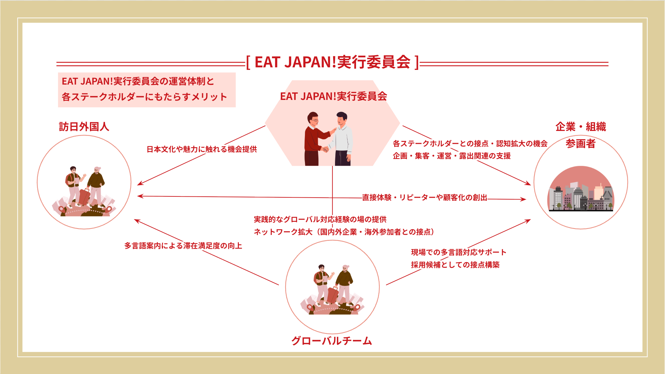 「EAT JAPAN!」は、日本の食・ファッション・伝統文化・アニメ/漫画などの文化を世界に届けることを目的とした、新しい体験型フェスティバル。訪日外国人が日本の魅力を五感で体験し、地域との交流を楽しむことができる。