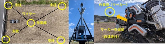 多用途ロボット「MU-0」は、圃場の4隅から張り出しているワイヤーが伸縮し交点部の装置を移動させることで、圃場内での作業を実施・支援する。