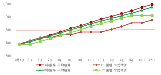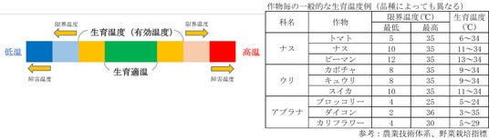 生育温度が10℃≦X≦28℃で、有効積算温度が800℃以上で収穫適期となる作物を、隣接したA市とB市それぞれの畑で同じ日に植え付けたケースでは、単純な平均積算温度はA市の方が高いが、有効積算温度はB市の方が高いため、収穫適期が早くなる。
