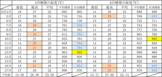 赤字は生育温度外を示しており、青字は有効積算温度としてカウントされていないもの、黄枠は収穫適期を示している。