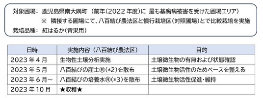 壌結(つちむすび)合同会社は、錦フロンティアコーポレート株式会社共同で、土壌微生物を活性させる環境再生型農法である「八百結び農法®(やおむすびのうほう)」によって、鹿児島県南大隅町の圃場におけるサツマイモ基腐病を克服したと発表した。この成果を受け、2024年度は実施圃場を拡大するという。