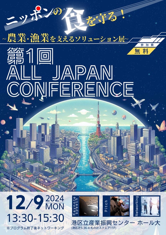 地方自治体と首都圏の事業者のビジネスマッチングを目指す「第1回 ALL JAPAN CONFERENCE ニッポンの食を守る!農業・漁業を支えるソリューション展」が2024年12月9日に港区立産業振興センターで開催される。参加費は無料。