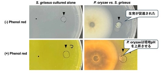 Pyricularia oryzaeは接触を介さずにStreptomyces griseusの生育を促進させる。単独培養時にはS. griseusはこの条件では増殖しないが(左)、P. oryzaeと共培養を行うと生育が促進された(右)。pH指示試薬を用いた解析により、P. oryzaeがアルカリ性の代謝産物を産生することで培地のpHが上昇し、その結果S. griseusの生育が促進されていることが示唆された
