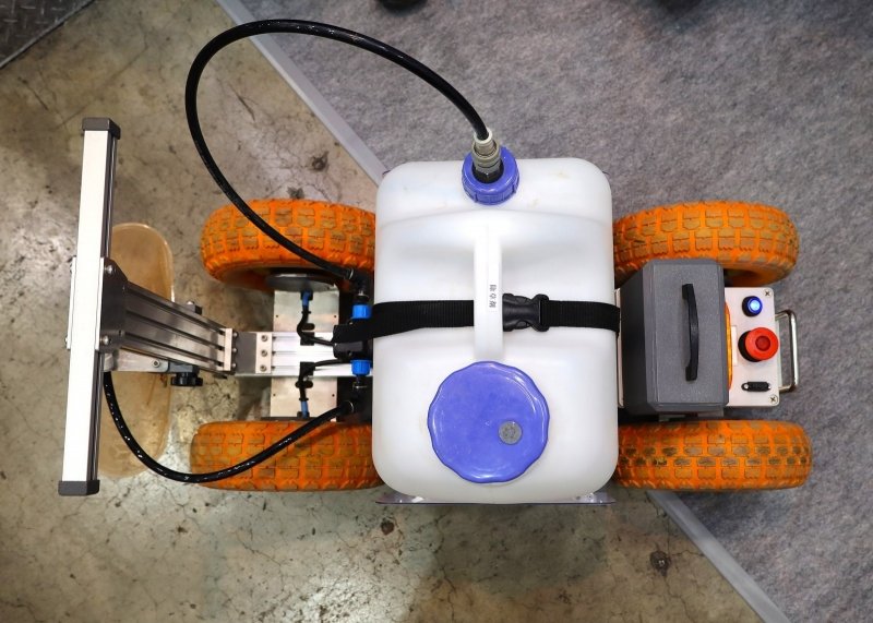 「リチウムイオン電池2個を動力とする電動で、最高作業速度は4km/h。ラジコンで操作できますから、動噴をつかった作業と比較して、軽労化と作業の効率化、それに安全性を確保できます」(山岸さん)