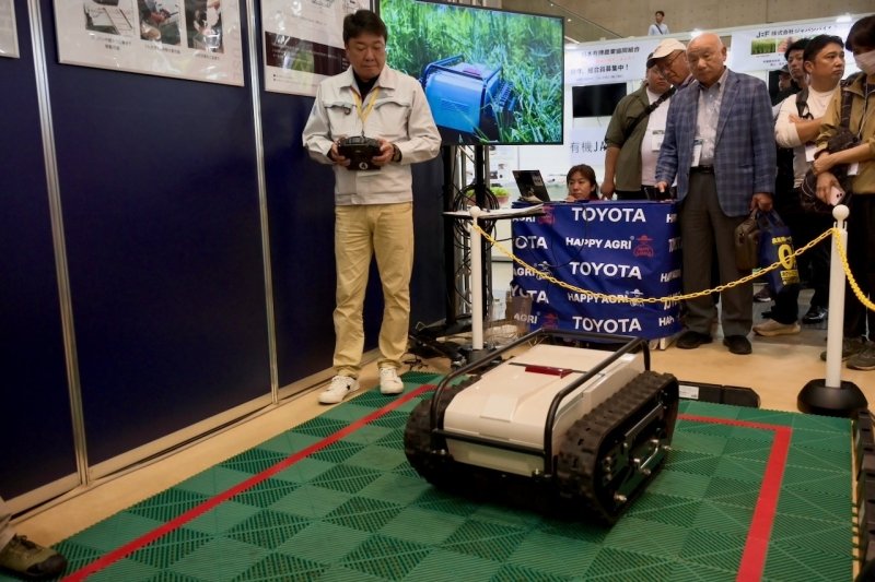 トヨタ自動車は土を直接計測するセンサーや、同社初となるラジコン除草ロボットなども展示。トヨタは工場の効率化のための「カイゼン」をベースにした「豊作計画」などで長年農業にも携わってきたが、いよいよ本業を生かしたスマート農業にも乗り出しそうだ