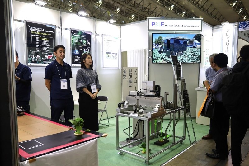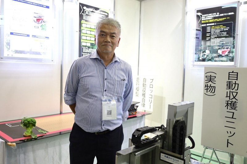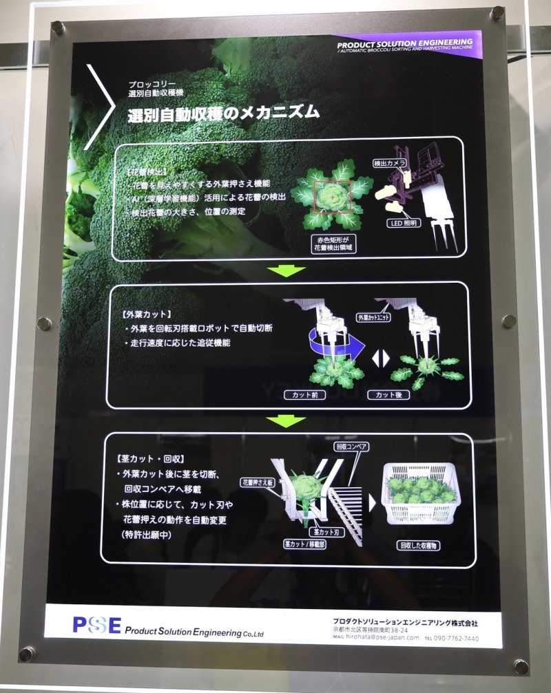 京都市に本社を置くPSE(プロダクトソリューションエンジニアリング)が展示していたのは、AIを搭載した「ブロッコリー選別自動収穫機」の収穫ユニットの現物と1/20スケール模型だ。