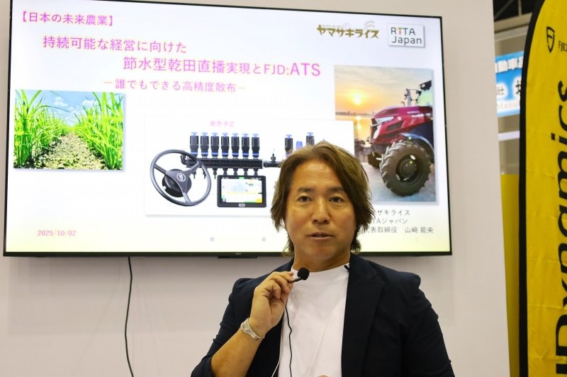 後付けできる自動操舵システムを日本に広く普及させた立役者ともいえるFJDynamics(FJD)が展示していたのは、乾田直播に最適な精密スプレー自動操舵システム「ATS」だ。この「ATS」を、節水型乾田直播栽培に利用しているヤマザキライスの山崎能央さんが、ブースにて特別ミニセミナーを実施していた。