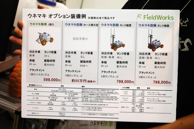 防除と除草の両方に使える『ウネマキ 防除』がフルセットに該当する(タンク横置とタンク縦置の2仕様あり)。タンク横置は安定性は高いものの横幅が520mmと広がってしまうため、狭い畝間には入ることができない。栽培条件に合わせて購入すると良いだろう。購入に当たっては、自治体によってはドローンと同じ扱いとなり補助金(2分の1~3分の1補助)を利用できる可能性があるため、購入前に確認してほしい。価格は59万8000円~と、かなりリーズナブルだ。