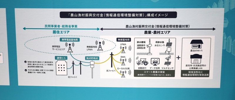 その前提として農水省では、農業農村インフラの管理の省力化・高度化やスマート農業の実装を図るとともに、地域活性化の取組に活用するための光ファイバーや無線基地局等の情報通信環境の整備を支援する施策として「農山漁村振興交付金(情報通信環境整備対策)」を創設しており、準備会のサポートを得ながら、この補助金を利用できるというわけだ。