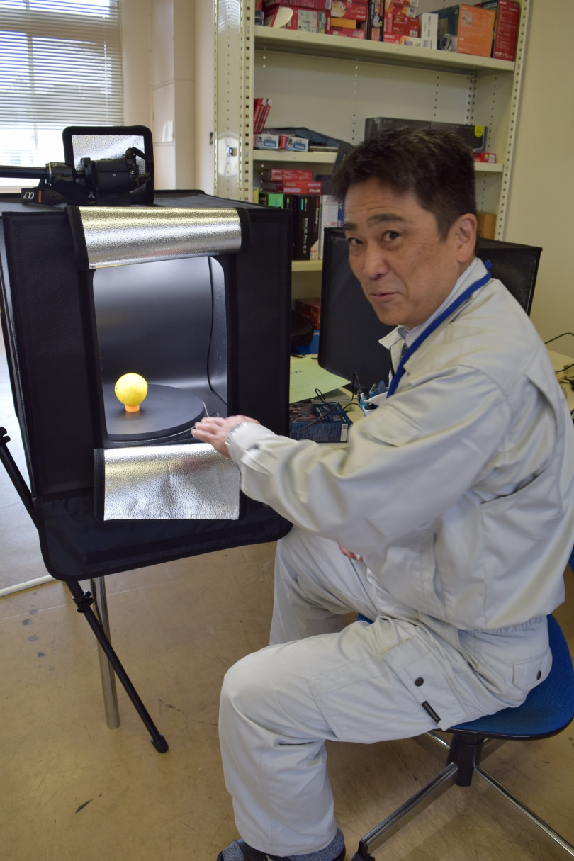 ミカンの向きを変えながら箱の上部に設置した一眼レフカメラで撮影