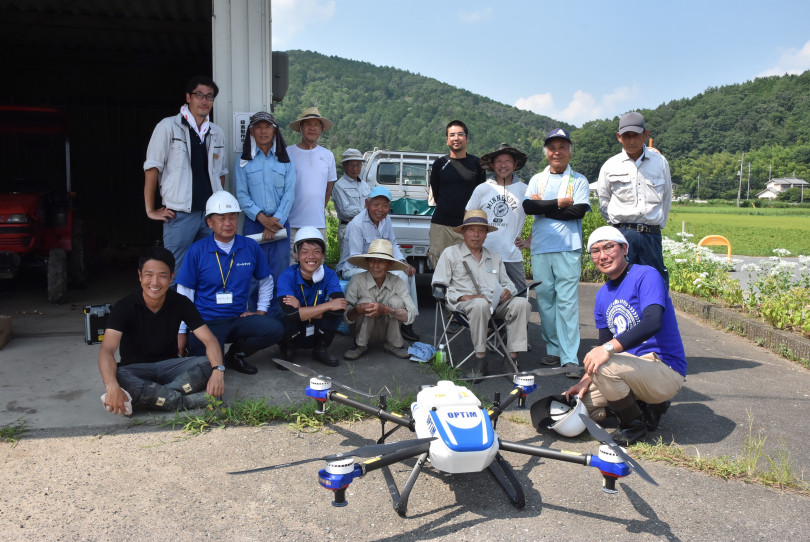 30度を超える猛暑の中、「丹波ささやまおただ」のメンバー、兵庫県丹波県民局丹波農業改良普及センター、技術を担当する株式会社オプティムなどの関係者が集合。JA丹波ささやま、丹波篠山市役所ら地域の関係者が見守る中、ドローンによる圃場の撮影や空中散布を行った。