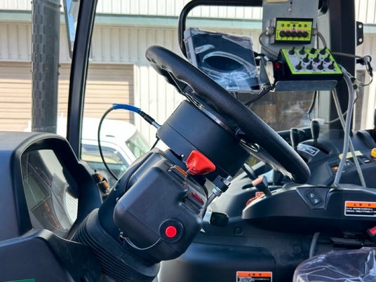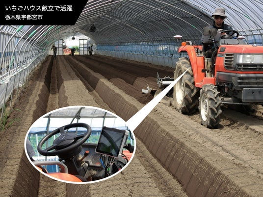 AG502は、手持ちのトラクターや田植機、移植機などに後付け可能な自動操舵システム。操舵精度はRTK使用時で±25mmと、高い精度での作業が可能だという。