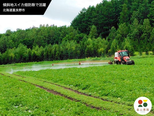 北海道富良野市で活躍するAG502取付済トラクター。傾斜地でも真っ直ぐに走行可能